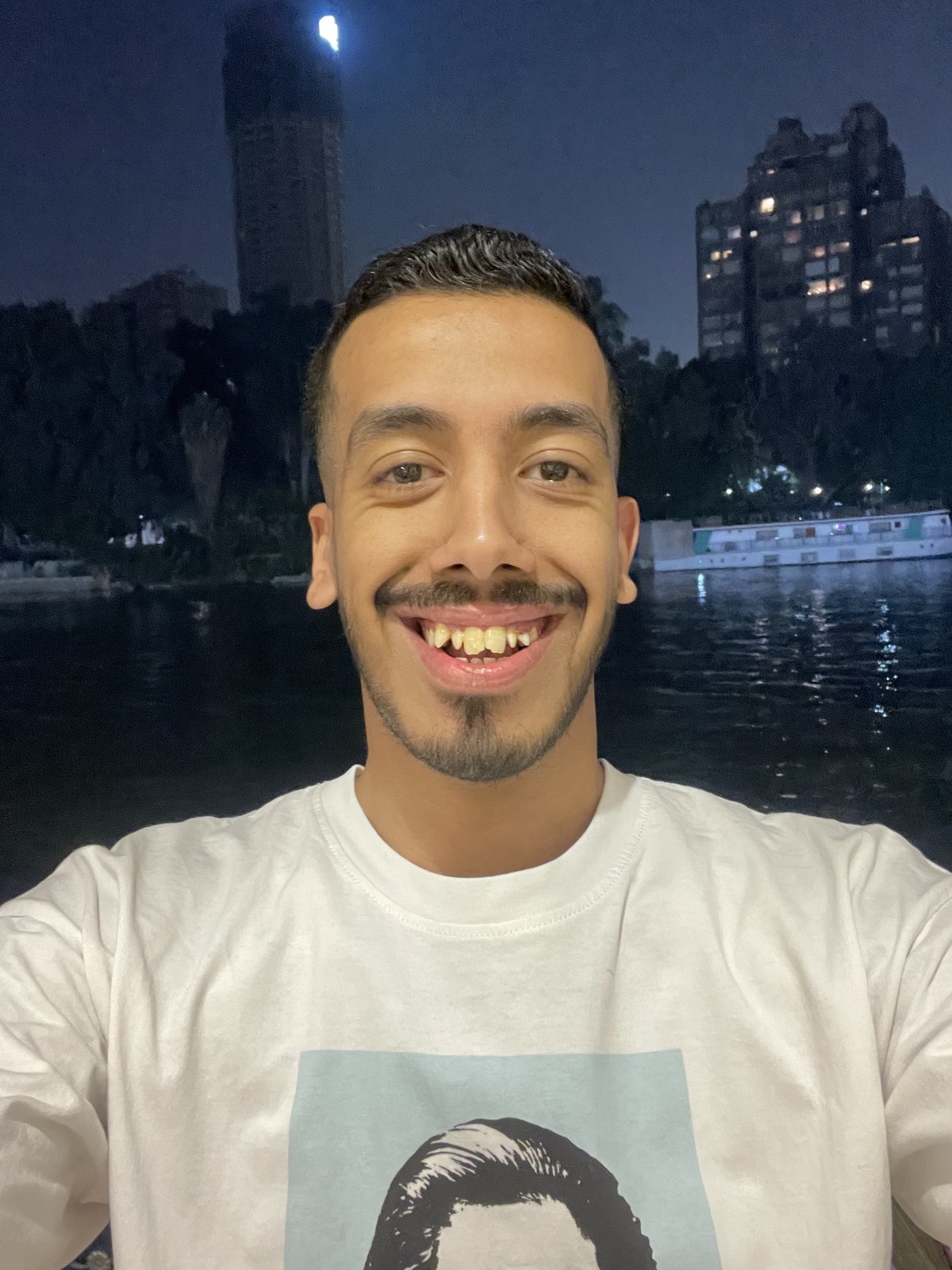 Take an extremely ordinary and unremarkable iPhone selfie, with no clear subject or sense of composition just a snapshot. The photo has band uneven lighting from streetlights or indoor lamps, causing mild overexposure in some areas. The angle is awkward and the framing is messy, giving the picture a deliberately mediocre feel, as if it was taken absentmindedly while pulling the phone from a pocket. The main character is me [uploaded person's face], and (Shikabala) stand next to me, And he smiles both caught in a casual, perfect moment. The background shows a lively bandung at night, with neon lights, traffic, and blurry figures passing by. The overall look is intentionally plain and random, capturing the authentic vibe of a poorly composed, iPhone selfie.