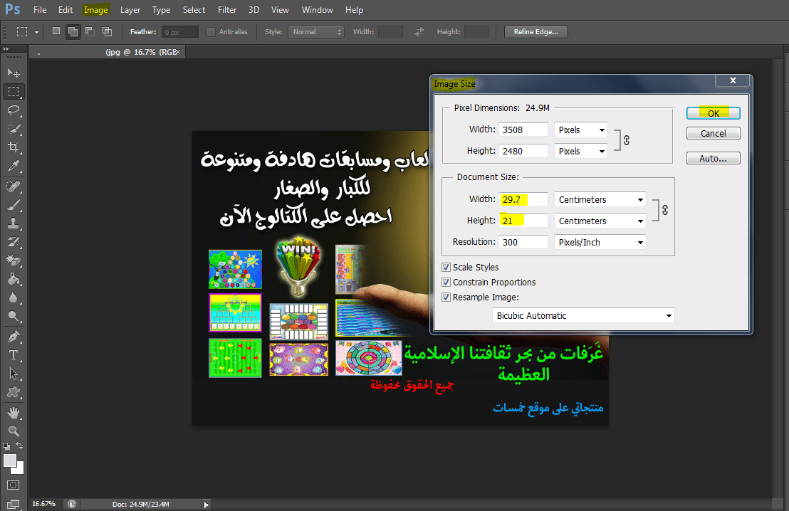 افتح الصورة بالفتوشوب >>> اختر Image >>> ثم Image Size ثم انظر على طول وعرض الصورة المراد إضافتها وذلك لتعديل الصفحة في برنامج Open Office بحيث يكون الناتج منسق ومرتب ...