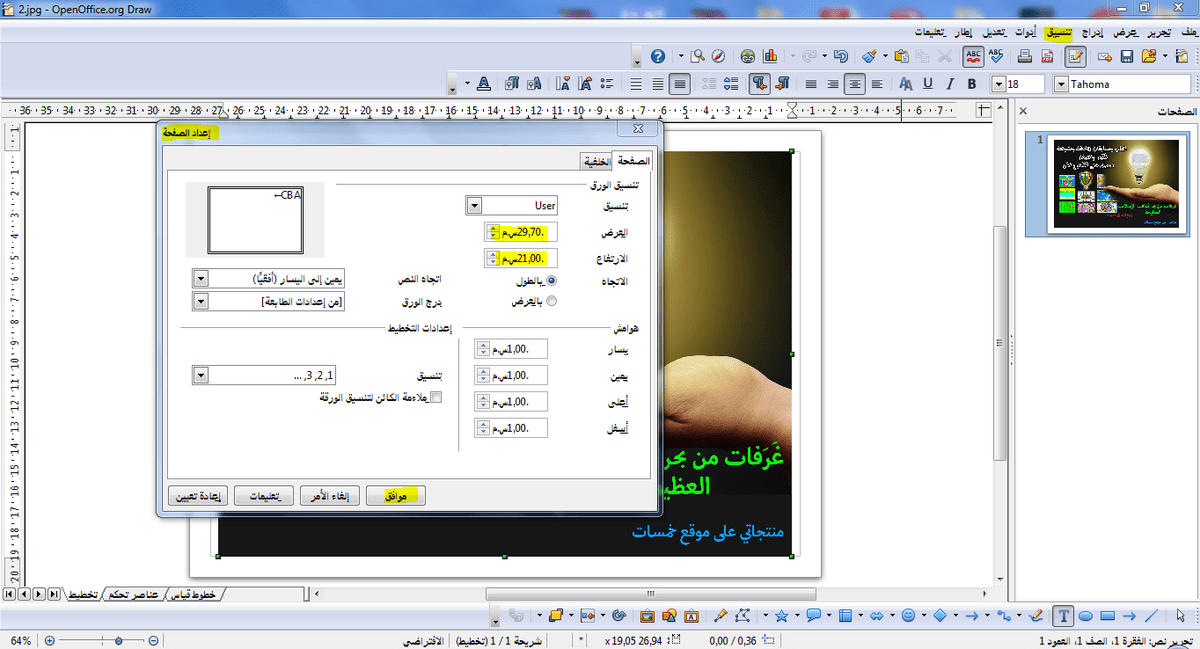 بعد أن فتحنا الصورة المطلوبة نختار "تنسيق" ثم >>> "الصفحة ..." >>> نقوم بتغيير الحجم بما يتناسب مع صورتنا المطلوبة بحيث يكون الناتج مميز .. وبإمكانا سحب والتحكم بحجم الصورة عبر النقاط الزرقاء المحددة للصورة عند فتحها ...
