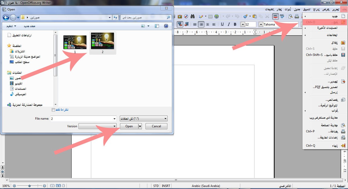 قم بالضغط على ملف >>> فتح >>> اختر الصورة المراد إضافة رابط عليها عبر فتح مسار الملف الذي تحتويه ثم اختر "فتح Open"..
