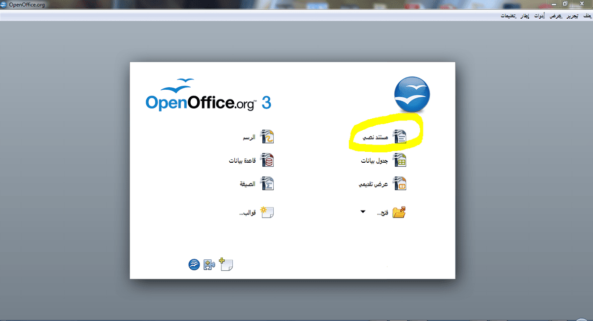 بعد تنزيل برنامج OpenOffice، بإمكانك تنزيله عبر موقعه الرسمي ، ثم قم بتسطيب البرنامج ومن ثم قم بضغط على أيقونته على سطح المكتب لتظهر الشاشة الترحيبية وقم بتحديد "مستند نصي"