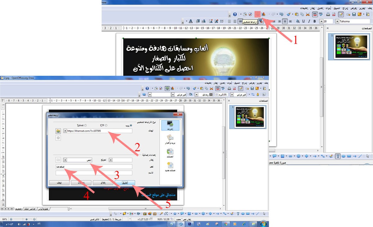 نختر أيقونة الارتباط التشعبي الموجودة في واجهة البرنامج كما في الخطوة (1) ثم نحدد الرابط الذي نريد الإنتقال له بمجرد الضغط عليه وهو في مثالنا (https://khamsat.com/?r=107595) ومن ثم نقوم باختار إما "زر" أو "نص" كما تم اختياره في مثالنا ... بإمكانا كتابة أي شيء ليضغط عليه المستخدم وينقله إلى المسار أو الرابط المطلوب ... كما بإمكانا عمل زر خاص ...