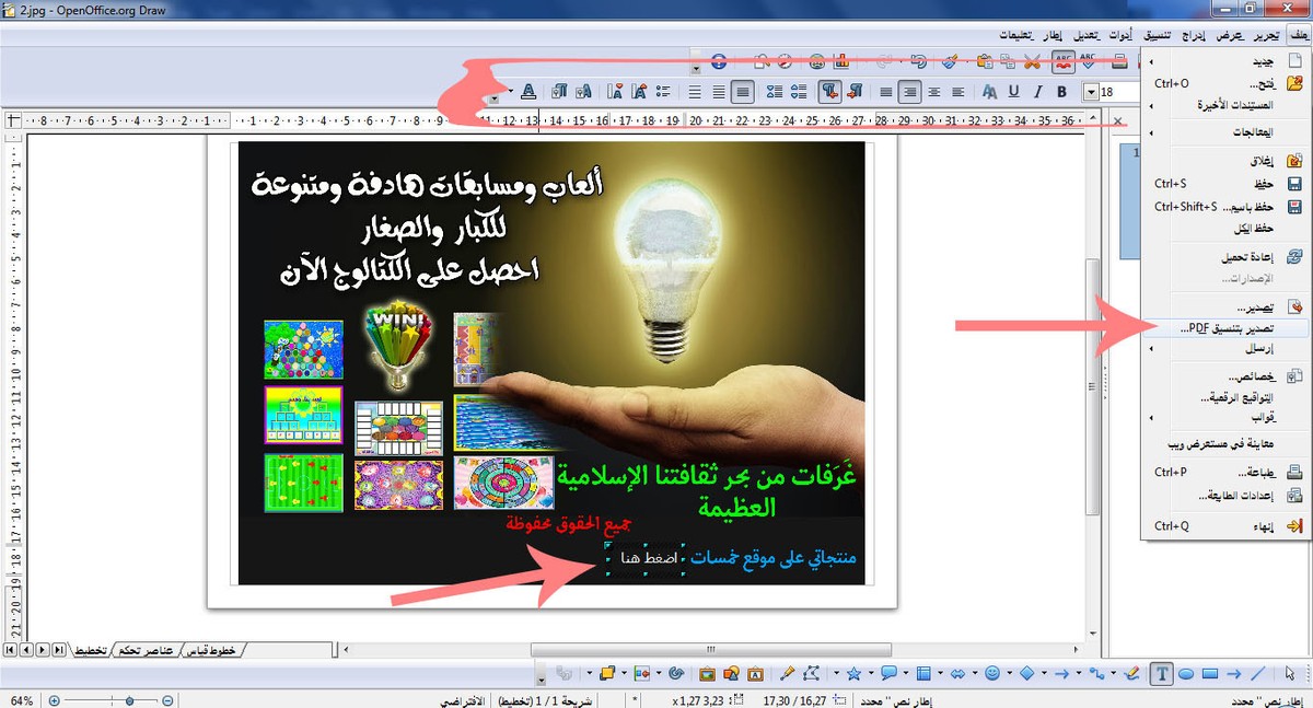بإمكانا التعديل على النص سواء بحجم ونوع الخط أو لون الخط وكل ما يتعلق بالخط ... ثم نختار "ملف" ونختار من القائمة المنسدلة "تصدير بتنسيق PDF .." وذلك لتصدير الملف على هيئة pdf ...