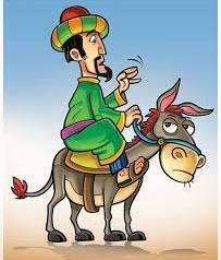 الصورة تصوّر رسم كاريكاتوري لرجل يقوم بركوب حمار. الرجل قد يكون يجلس على ظهر الحمار، ممسكاً بالزمام أو السرج، بينما يكون الحمار واقفًا أو يمشي. يتم تصوير الرجل والحمار بشكل مبهج ومميز، بطريقة غير واقعية معبرة عن خصوصية الكاريكاتير.