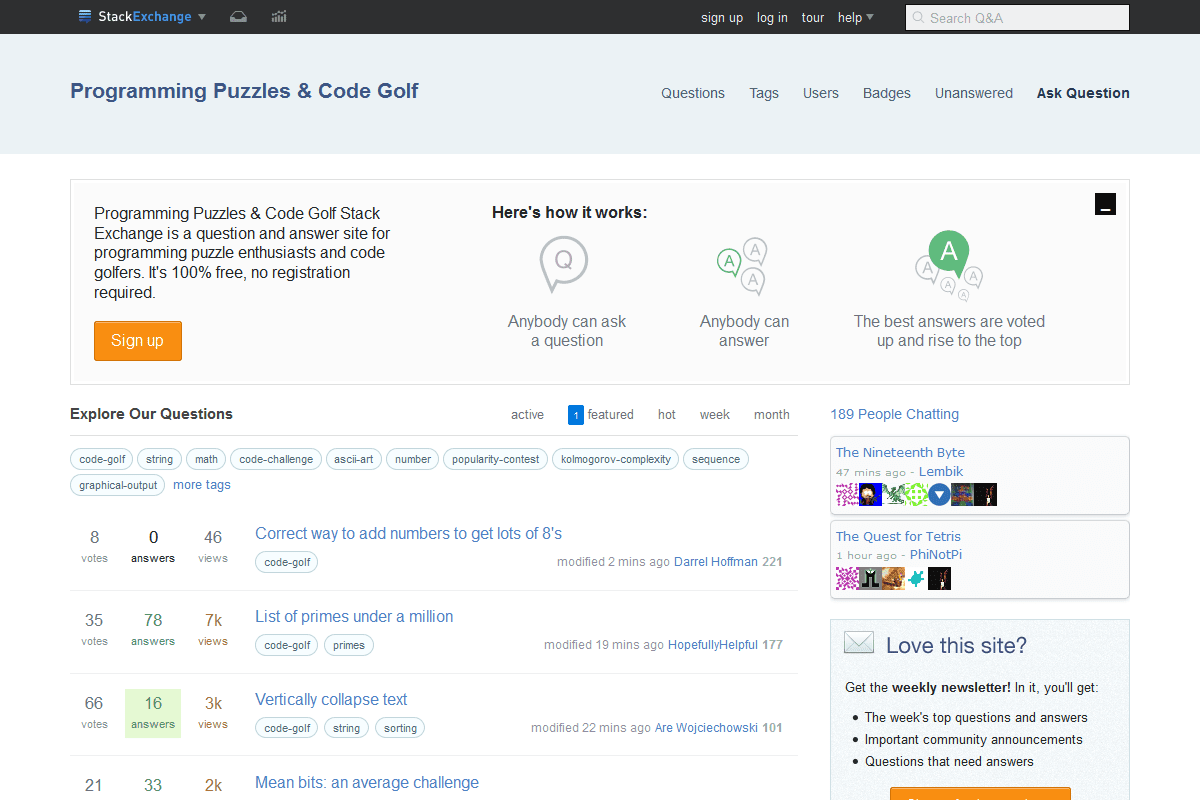 Programming Puzzles & Code Golf هو موقع الأسألة والإجابات لهواة الألغاز البرمجية. مجاني 100٪، ولا يتطلب التسجيل.