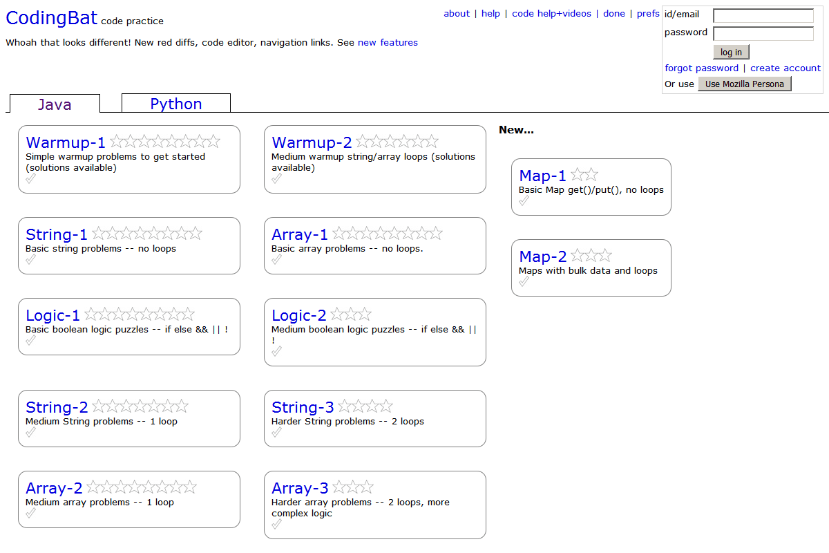 CodingBat هو موقع مجاني لمشاكل برمجية حية لتنمية المهارات في جافا وبيثون.