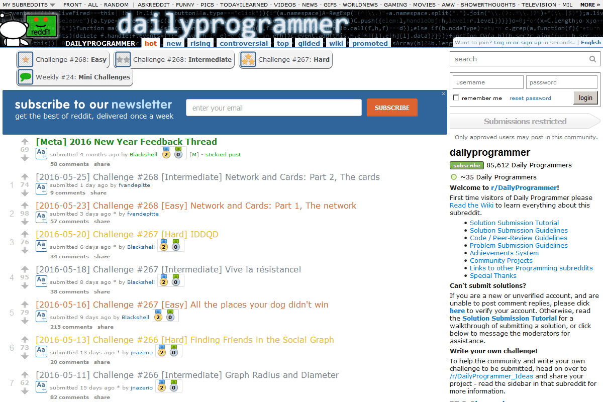 Dailyprogrammer هو حول تحدي المبرمجين من كل مستويات المهارات مع تحديات البرمجة الأسبوعية. وتنشر 3 تحديات كل أسبوع في مستويات صعوبة متزايدة. ويمكن الاستعراض الجماعي للحلول ويشارك المجتمع للوقوف على الآراء والتعليقات.