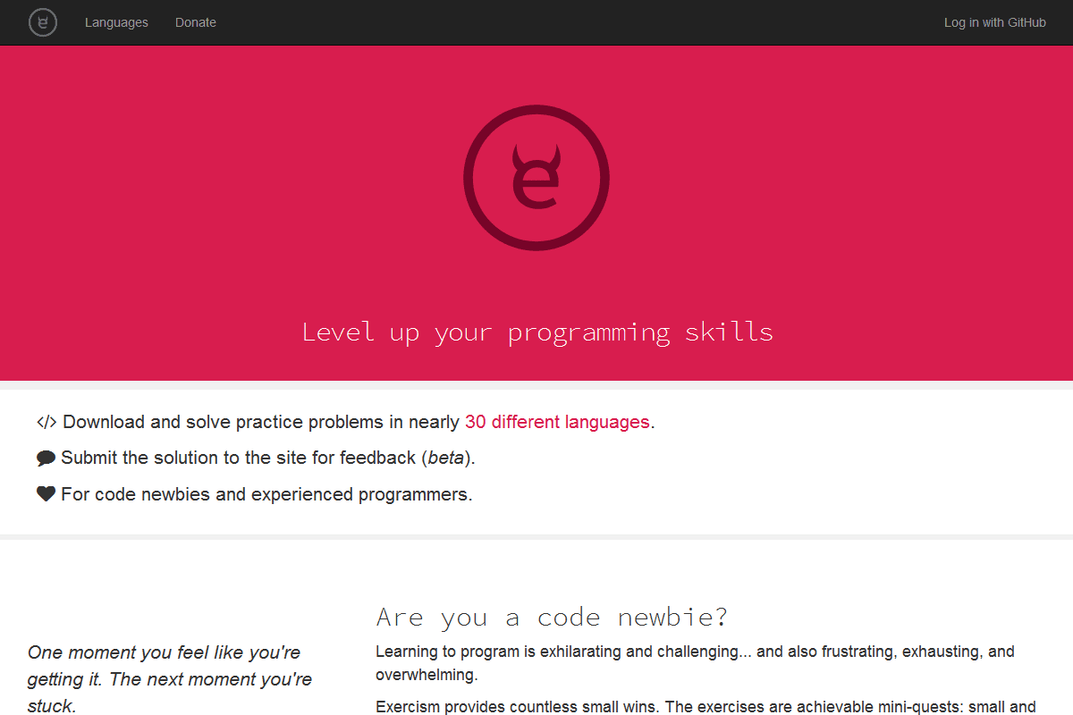 يوفر Exercism عدد لا يحصى من المهام الصغيرة لتحقق فيها انتصارات تحفزك على الاستمرار. التدريبات قابلة للتحقيق مصغرة و يطلب تنفيذ المهام الصغيرة والمحددة جيدا، بجانب ما يكفي من التعقيد لكشف الثغرات المعرفية.