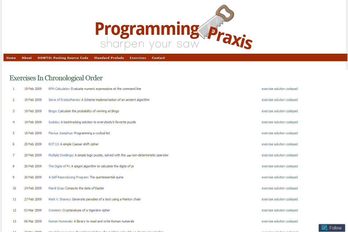 هذه المدونة تنشر عمليات البرمجة أسبوعيا، على الأقل، بحيث يتمكن المبرمجين الأذكياء من الحفاظ على مهاراتهم من خلال العمل على التمارين والتفكير خارج مجموعتهم والأطر التقليدية.