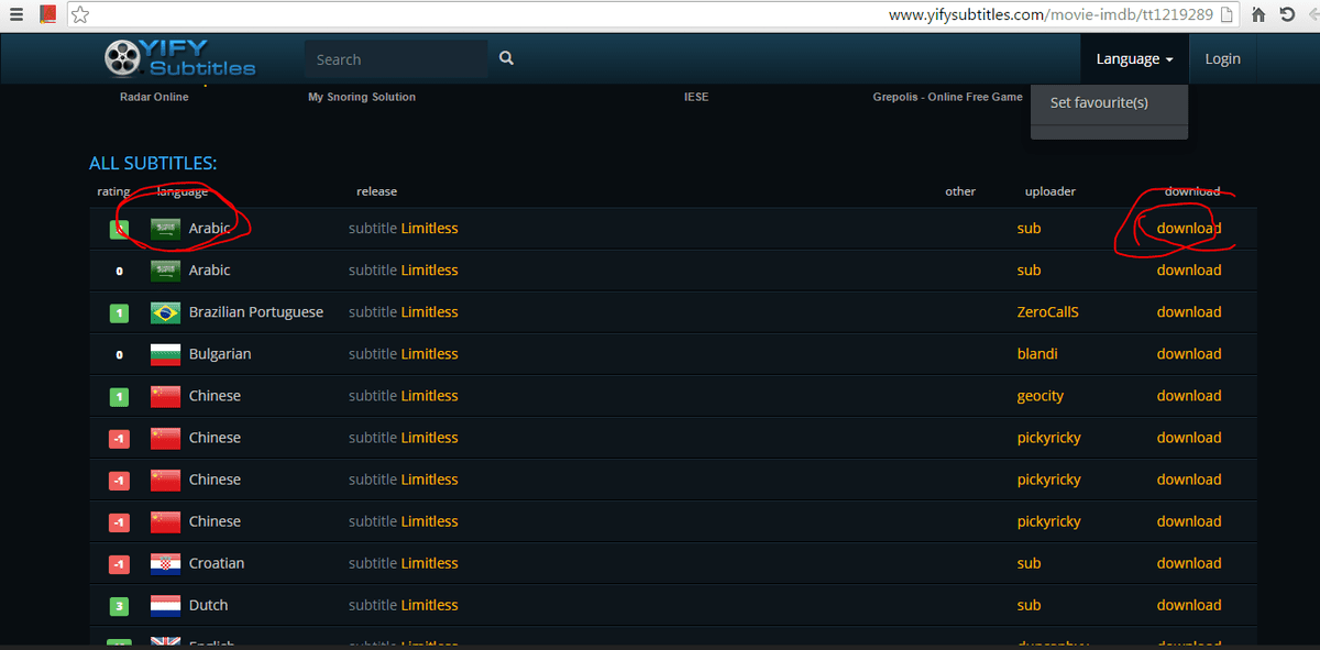 فتح موقع (http://www.yifysubtitles.com) البحث عن الفيلم في خانة البحث، الضغط على Download للترجمة التي ترغب بها هناك كل اللغات ( ومن ضمنها اللغة العربية) ...