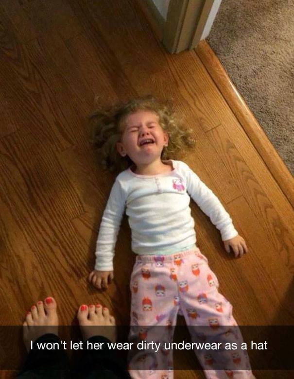 تبكى لأن أمها لا تسمح لها بأن ترتدى ملابسها الداخلية المتسخة كقبعة للرأس