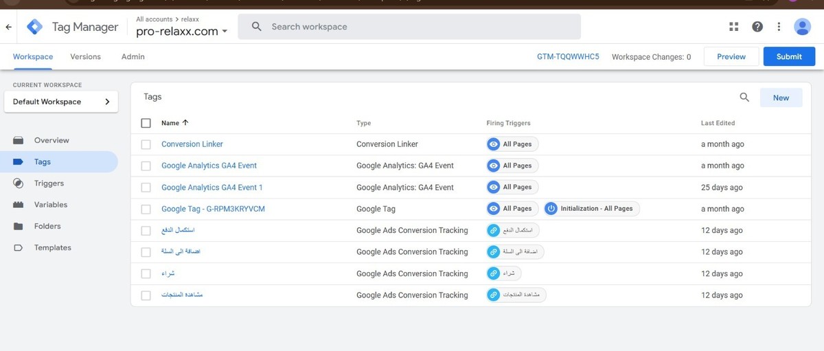 موقع ريلاكس _ https://pro-relaxx.com/ تحميل الصورة رابط الصورة تم انشاء حلمات اعلانية احترافية على Google ads لتحقيق افضل عائد من المبيعات تحميل الصورة رابط الصورة نتائج الحملات الى الان تحميل الصورة رابط الصورة نتائج الحملات فى جوجل تحميل الصورة رابط الصورة تم ربط جوجل انلاتيكس بجوجل ادز وجوجل تاج مانجر تحميل الصورة رابط الصورة تم ربط جوجل تاج مانجر واعداد وظبط الاحالات الناجحة وربطهم ايضاً بالموقع تحميل الصورة رابط الصورة تم ربط جوجل ميرشنت ورفع حملات احترافية من خلاله للوصول الى الشريحة المستهدفة تحميل الصورة رابط الصورة منذ سنة 1 مشاهدة
