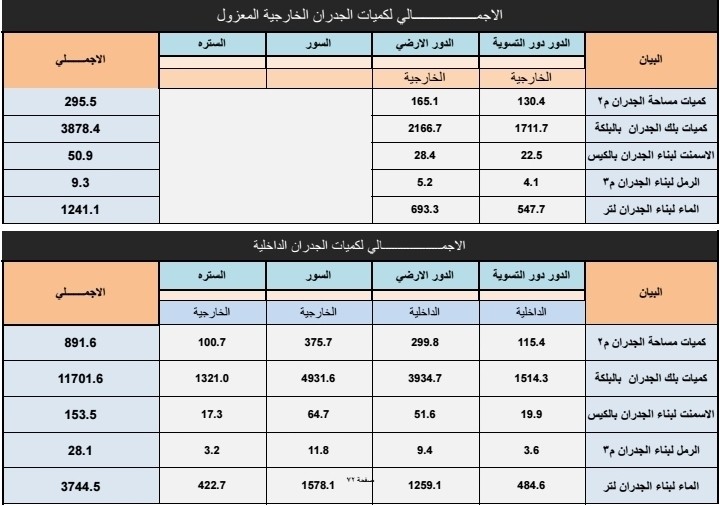 كميات البلك المعزول للجدران الخارجية والعادي للجدران الداخلية