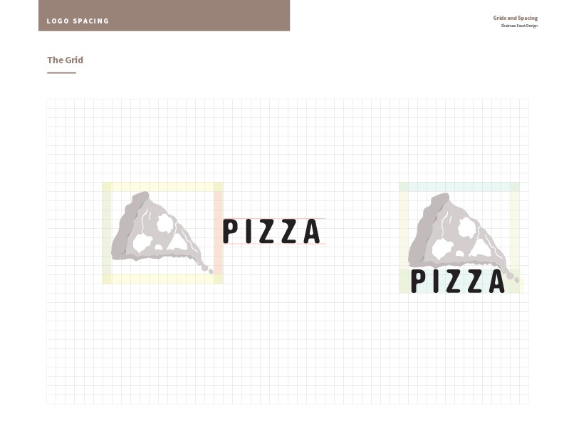 اختبار أبعاد الشعار على الجريد، مع القياسيات الموضحة لإظهار الشعار بأوضاع مختلفة، مما يتيح المرونة للعميل في الاختيار.